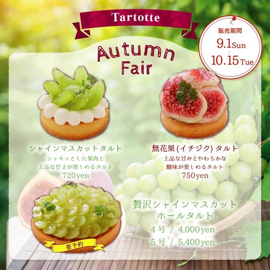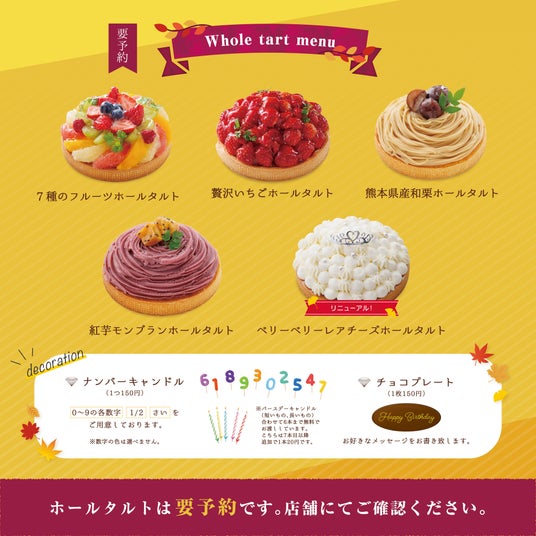 2024年10月10日(木)~12日(土)の3日間は、大人気の7種のフルーツタルトを先着20名の方に半額でご提供♪ (条件:イオンモール各務原インター店のinstagramフォローと公式ラインを登録したお客様に限ります)
