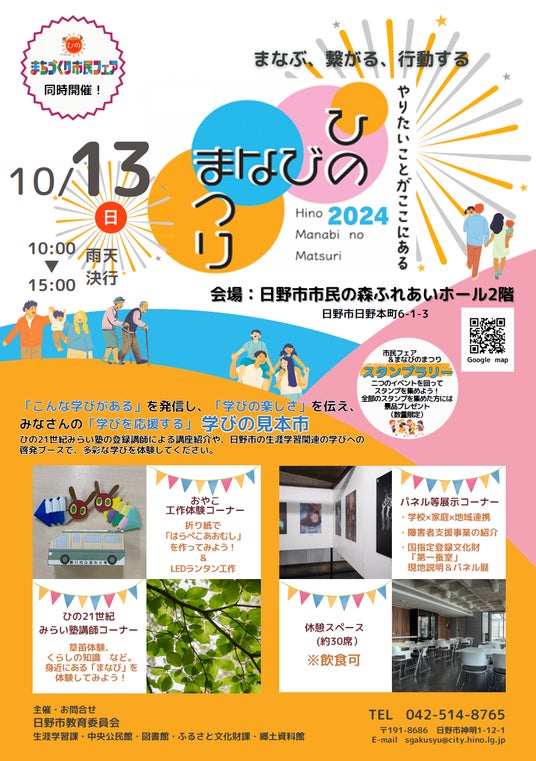 ひのまなびのまつりは、市民の皆さまに学びの楽しさを伝え、学びを応援することを目的に、講座登録制度「ひの21世紀みらい塾」の講師による、まなびの紹介・体験ブースなどをご用意しています。