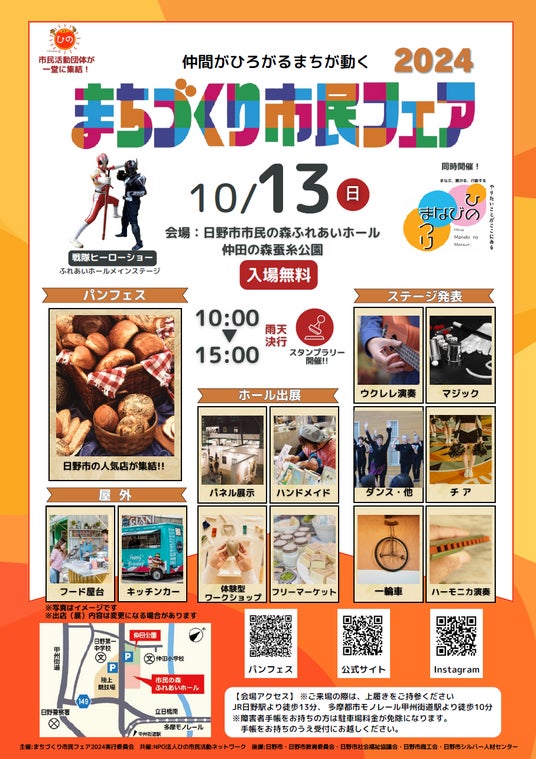 まちづくり市民フェアは、市内で活動する市民活動団体・個人が一同に集まり、市民の皆さまに普段の活動を知って、見て、体験してもらうイベントです(主催:まちづくり市民フェア2024実行委員会)。