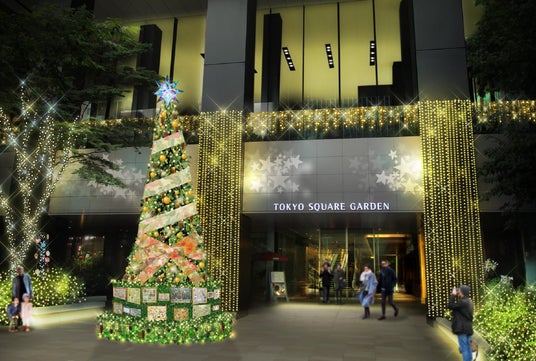 東京スクエアガーデンの冬季イルミネーションでは、環境負荷の低減を目指した取り組みを実施してきました。ライトアップには100%再エネ由来の電力を使用するほか、2022年には廃材を再利用したアート作品、2023年には古着や残布、端材を使ったオーナメントを装飾に使用したクリスマスツリーを展示しています。