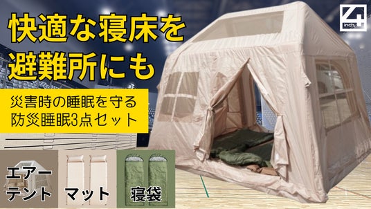 「防災睡眠3点セット」はエアーテント、エアーマット、寝袋がセットになった防災グッズです。近年、地震や台風などの災害が頻発しており、避難所での生活を余儀なくされることも多くなりましたが、避難所ではプライバシーの問題や、窃盗、性犯罪といった不測の事態が発生する可能性が指摘されており、問題になっていました。そこで快適な空間を提供する災害用製品として本製品は制作されました。