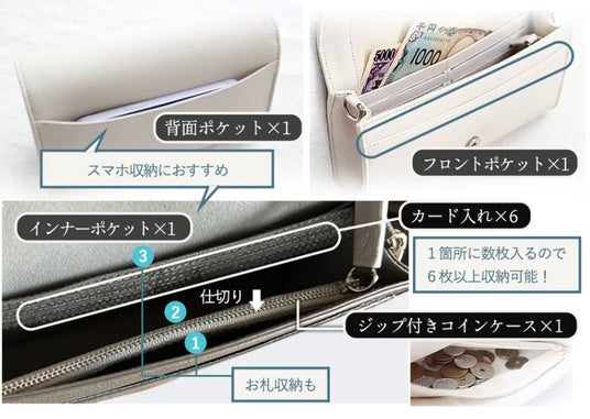 仕切りやポケットを充実させ、カード入れ・コインケース付きでウォレットバッグとしても活躍します。