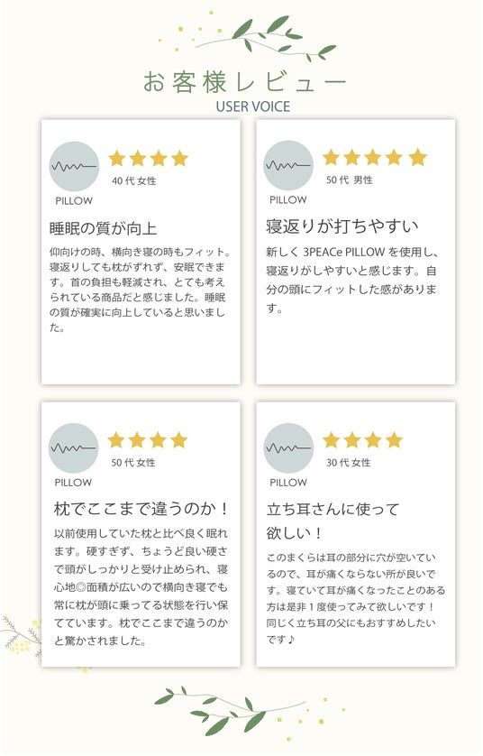 3PEACePILLOW(スリーピースピロー)をご使用いただいたモニター様からお喜びの声をいただいています。
