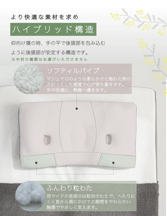 より快適な素材を求め、枕の上層はソフテイルパイプとふんわり粒わたを採用。
