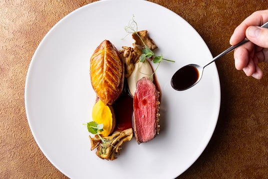 ・フランス産マグレカナールのロースト フォアグラのパイ包み焼き マディラソース 根セロリと人参のピュレ 舞茸と白トリュフ