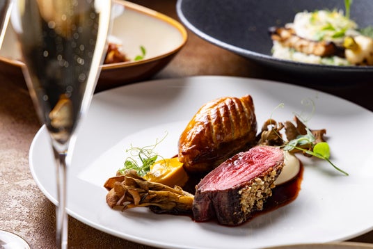 季節の食材をふんだんに使用し、KASAの味をご堪能いただける「シーズナルコースディナー」に、秋の恵みを存分に味わう新メニューが登場しました。前菜は、瑞々しい和梨と香り高いフェンネルを使用し、新鮮なヒラメをバジルオイルで仕上げた美しい一品。秋の始まりを感じさせるさっぱりとした味わいです。メインディッシュは、フォアグラが香る最高級の鴨肉「マグレカナール」のローストと、芳醇なフォアグラのパイ包み焼きが登場する贅沢な一皿。濃厚なマディラソースが絶妙に絡み、根セロリと人参のピュレ、舞茸と白トリュフが華やかな風味を添えます。シェフが織りなす秋の美食の数々と共に、秋の夜長をお楽しみください。