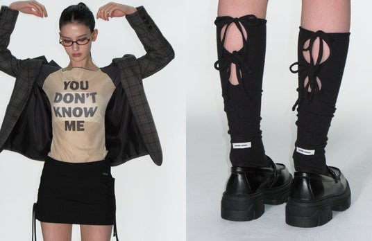(左)ジャケット:CHECK OVERSIZED BLAZER 23,650円、トップス:MESH LETTERING OFF SHOULDER TOP 7,370円、ボトムス:RIBBON SLIT SKIRT PANTS 11,100円、(右)レッグウォーマー:KNIT RIBBON LEG WARMERS 4,840円