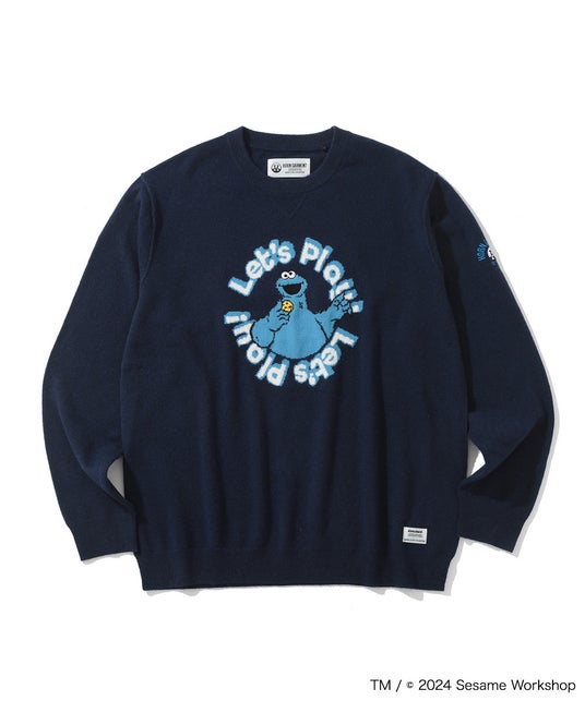 セサミストリートとのコラボニット。上質なカシミヤを使用し、 フロントにはジャガードでキャラクターが編み込まれたキャッチーなデザイン。左袖にはブランドアイコンの刺繍を施し程よいゆとりのレギュラーシルエットで上品かつ快適な1着です。