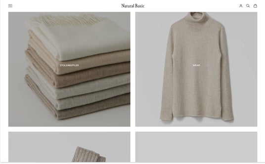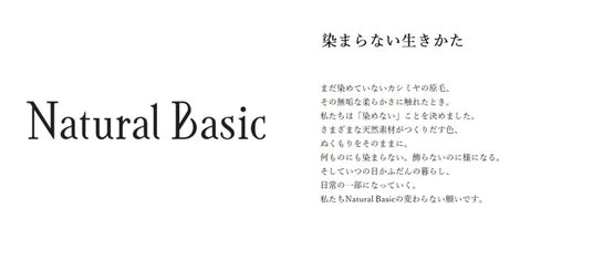 2000年にスタートしたNatural Basicは、2024年4月にブランドロゴとブランドコピーをリニューアルしました。質の良いカシミヤ素材を中心に天然素材が持つ風合いや色合いを大切にする、また地球環境にもやさしい生産方法のひとつである「染めない」ものづくりを通じて、タイムレス・エイジレス・ジェンダーレスな企画の提案をおこなってまいります。
