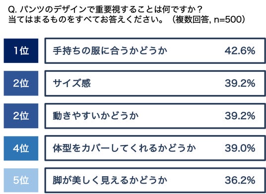 さらに、パンツ選びの際に重要視するポイント1位は「手持ちの服に合うかどうか(42.6%)」、2位「サイズ感(39.2%)」「動きやすいかどうか(39.2%)」、4位「体型をカバーしてくれるかどうか(39.0%)」、5位「脚が美しく見えるかどうか(36.2%)」という結果となり、どのポイントについても僅差であることから、パンツ選びにおいて複数の要素が重要視されていることが伺えます。