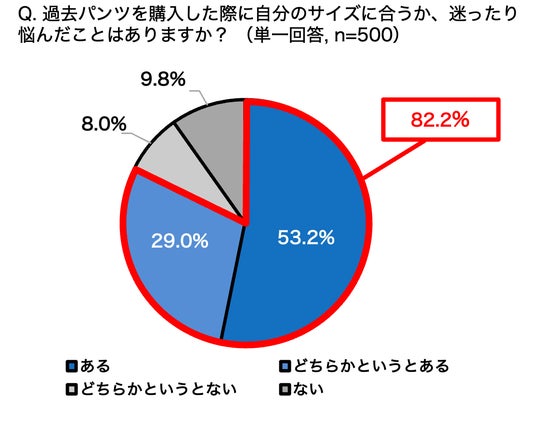 20歳~59歳の働く女性を対象に、洋服選びで自分に合うサイズを見つけるのが難しいと感じるアイテムを聞くと、全体の半数(49.4%)が「パンツ」と答えており、働く女性の2人に1人が洋服選びにおいて「パンツ」のサイズ選びが最も難しいと感じていることが判明。さらに過去にパンツを購入した際に、自分のサイズに合うか悩んだことはあるかを聞くと、全体の8割以上(82.2%)があると回答、パンツ選びでお悩みを抱えている人が多数いることが明らかとなりました。