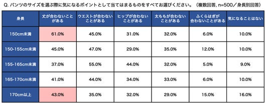 また、身長別の内訳を見ると、150cm未満の人の約6割(61.0%)と170cm以上の人の4割以上(43.0%)が、「丈が合わないことがある」と回答しており、他の項目よりも高い割合であることがわかりました。この結果から、比較的身長の低い人と高い人が、パンツ選びの際に丈を気にしていることが推察されます。
