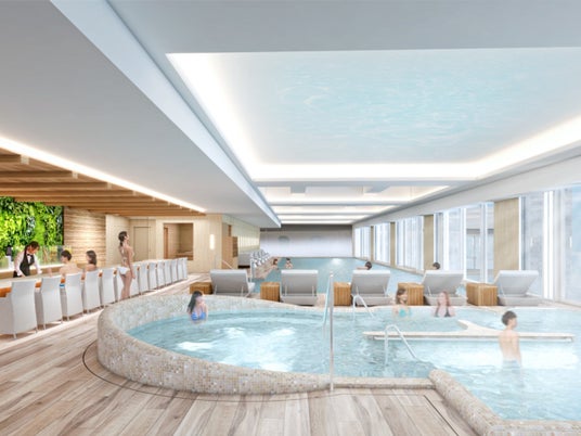 同施設内には、天然温泉や高濃度炭酸泉をはじめとした温浴を愉しむ大浴場、最先端マシンを導入したフィットネスジム、多岐に渡るレッスンプログラムを行うスタジオ、うめきた公園を一望する屋外インフィニティプール、アクアジムも備えた屋内プール、岩盤浴・溶岩浴、リラクゼーションサロンなど充実の施設が揃います。御食事処、ラウンジでは、健康とウェルビーイングのコンセプトに基づき、食事療法も取り入れたメニューを提供します。