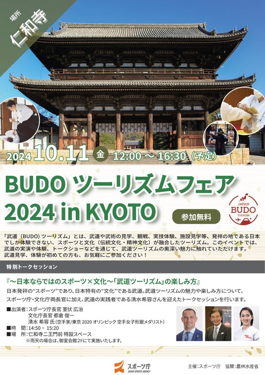 「武道ツーリズム」は、世界的に関心が高く文化的に価値がある「武道」の見学、観戦、実技体験など、日本でしか体験できないツーリズムです。そんな「武道ツーリズム」を日本文化と共により多くの方々に知っていただくため、10月11日(金)、京都市にある仁和寺にて、無料参加型のイベントを開催します。