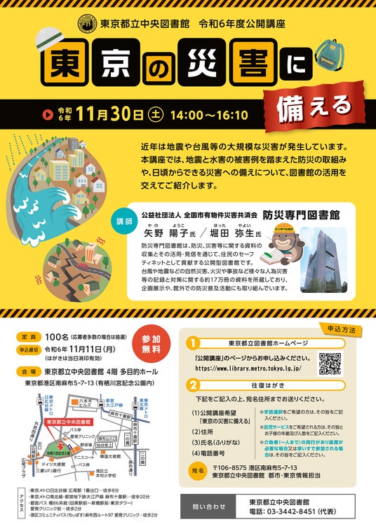 東京都立中央図書館では、都市や東京に関する豊富な所蔵資料を活用したサービスを行っています。令和6年度は「防災」をテーマに、公開講座「東京の災害に備える」を開催します。