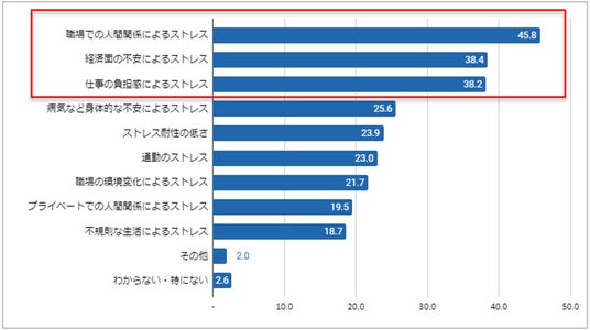 ストレスにより精神面の不調や不安を感じていると回答された方に、なぜ精神面の不調や不安を感じていると思うか聞いたところ、トップ3は「職場での人間関係によるストレス」(45.8%)、「経済面の不安によるストレス」(38.4%)、「仕事の負担感によるストレス」(38.2%)でした。