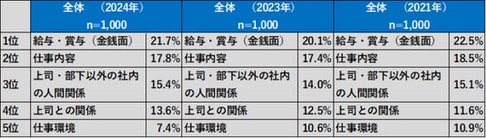 ビジネスパーソンが勤務先でストレスを感じる1番の要因は、4回連続で「給与・賞与(金銭面)」(21.7%)との結果になりました。また、2位~5位は「仕事内容」(17.8%)、「上司・部下以外の社内の人間関係」(15.4%)、「上司との関係」(13.6%)、「仕事環境」(7.4%)と、2021年から3回連続でトップ5の順位は全く同じでした。新しい働き方が浸透しても変わらず、多くのビジネスパーソンのストレスや悩みになっていることが明らかになりました。