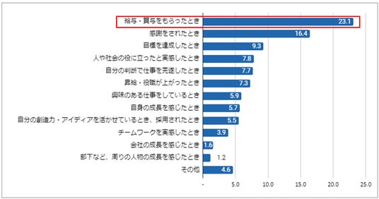 仕事をする上で、最もやりがいを感じる場面について聞いたところ、最も多かったのは「給与・賞与をもらったとき」(23.1%)、次に多かったのは「感謝をされたとき」(16.4%)でした。