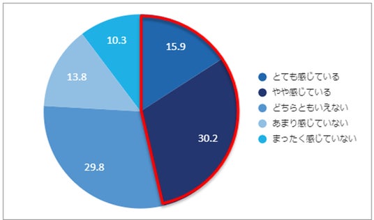 ストレスにより精神面の不調や不安を感じることがあるか聞いたところ、「とても感じている」(15.9%)、「やや感じている」(30.2%)、「どちらともいえない」(29.8%)、「あまり感じていない」(13.8%)、「全く感じていない」(10.3%)でした。