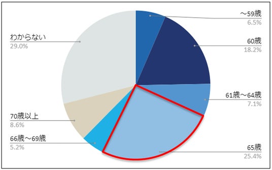 希望する定年退職の年齢を聞いたところ、「65歳」(25.4%)が最も多く、「70歳以上」(8.6%)も比較的多い結果となりました。65歳以上と回答した方を合計すると39.2%となり、人生100年時代と言われる中、年齢を重ねても働きたい意欲がある方が一定数いることが分かりました。
