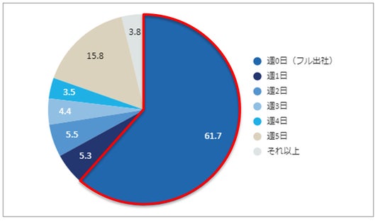 一週間の平均在宅勤務日数を聞いたところ、「0日(フル出社)」(61.7%)が6割以上を占め、次いで「週5日」(15.8%)でした。