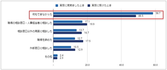 ハラスメントを見聞きした後、どのように対処したかを伺ったところ、「何もできなかった」(58.7%)と回答した人が最多でした。多くの人は他者のハラスメントに遭遇した際、行動に移すことは難しく、その結果ハラスメントが放置されてしまっている現状が分かりました。なお、自身がハラスメントを受けた際も約半数の人が「何もできなかった」(48.5%)と回答し、最多でした。