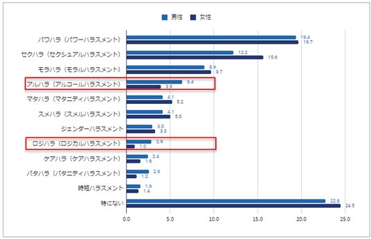 男女別に、実際に受けたことがあるハラスメントを見ると、「パワハラ」は男女ともに同程度ですが、「セクハラ」は女性が3.4ポイント多い結果となっています。また、男性が「アルハラ」「ロジハラ」などを女性よりも多く受けていることが分かりました。