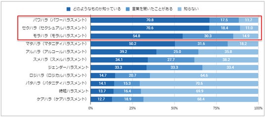 ハラスメントに関する言葉を知っているか調査したところ、最も知られているのは「パワハラ」(70.8%)で、次いで「セクハラ」(70.6%)、「モラハラ」(54.8%)でした。