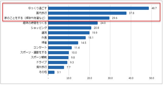有給休暇で行ったことを聞いたところ、トップ3は「ゆっくり過ごす」(48.7%)、「国内旅行」(37.8)、「家のことをする(掃除や洗濯など)」(29.6%)でした。