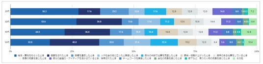 年代別に見ると、20代で最も多かったのは「給与・賞与をもらったとき」(55.2%)、次に多かったのは「目標を達成したとき」(23.2%)でした。一方、50代で最も多かったのは「感謝をされたとき」(40.0%)、次に多かったのは「給与・賞与をもらったとき」(32.0%)で、年代によって仕事のやりがいが異なることが明らかになりました。