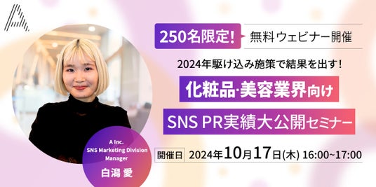 株式会社A(https://acetokyo.com/)は、化粧品・美容業界のマーケティングご担当者様に向けて、「2024年駆け込み施策で結果を出す! 化粧品・美容業界向け SNS PR実績大公開セミナー」と題した無料ウェビナーを、10月17日(木)にオンラインで開催します。