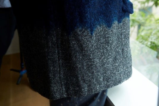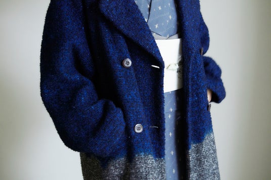 昨年より登場した、ツイード素材のPコート。秋冬らしさを感じられるツイード素材に絞り加工を施した一着。尾州で織られたツイード生地は、タンブラー加工を施すことでふんわりとした仕上がりで、羽織った時の軽さと暖かさが魅力です。裾部分は『帽子染め分け絞り』の染め分けによる滲みが、機械では生み出せない趣のある表情を見せてくれます。大きめな衿は着姿のポイントとなり、洋服でもきものでもご着用いただけるコートです。