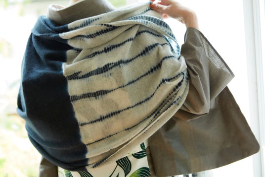 保温性が高く、滑らかな肌触りがとても心地よいショールです。絞りの技法によって生み出される表情の違いを楽しめるアイテム。ニット素材×絞りの新鮮なデザインがきものとの相性も良く、秋冬の着姿を彩ります。モンゴルで一貫生産されている上質なカシミヤ100%を使用。
