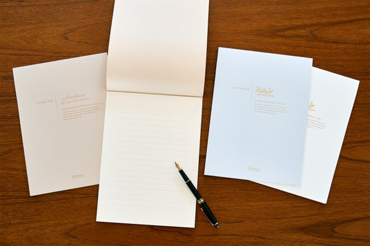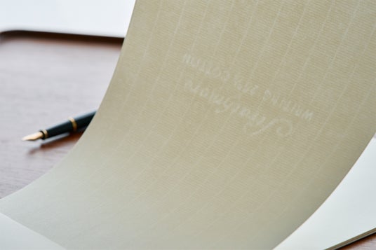 本格的ステーショナリー用紙の《ストラスモアライティングレイドN》は、コットンリンターパルプ配合で柔らかく、クラシカルな簀の目模様が魅力。滑りすぎず適度な書きごたえがあります。製紙メーカーの品質保証の証、ウォーターマーク(透かし)が入っており、 格式高くフォーマルな印象でビジネスシーンにおすすめ。書きやすい罫線台紙がついた10枚綴りのレターパッドです。
