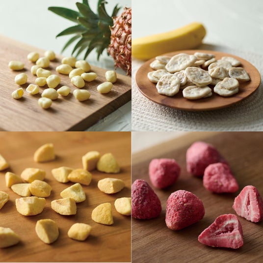今回発売する不揃いチョコシリーズは、パイナップル、バナナチップにヨーグルト味のチョコレートをかけた「不揃い パイナップルヨーグルトチョコ」、「不揃い バナナチップヨーグルトチョコ」と、フリーズドライしたアプリコット、いちごの中にチョコレートをしみこませている「不揃い しみこみチョコ アプリコット」と「不揃い しみこみヨーグルトチョコ いちご」の4種類です。