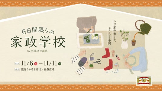 1716年創業の奈良の老舗、株式会社中川政七商店(所在地:奈良県奈良市 代表取締役社長 十四代 千石 あや)は、初の体験型イベント「6日間限りの家政学校」を11月6日(水)~11月11日(月)に、阪急うめだ本店 9階祝祭広場(大阪府大阪市)にて開催いたします。衣食住・暮らしの道具を取り揃えるマーケットのほか、ものを長く使うための修繕や季節を取り入れたインテリアを学ぶワークショップ、豪華ゲストによるトークイベントの3つのプログラムで、暮らしの愉しみかたを学ぶ場を提供します。