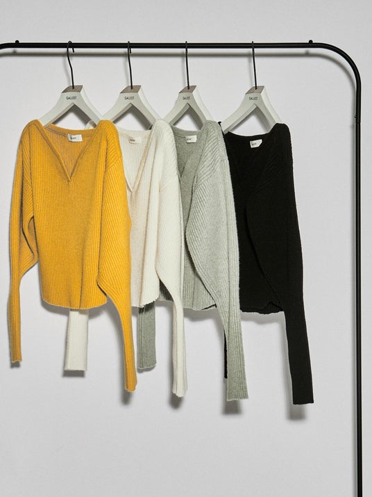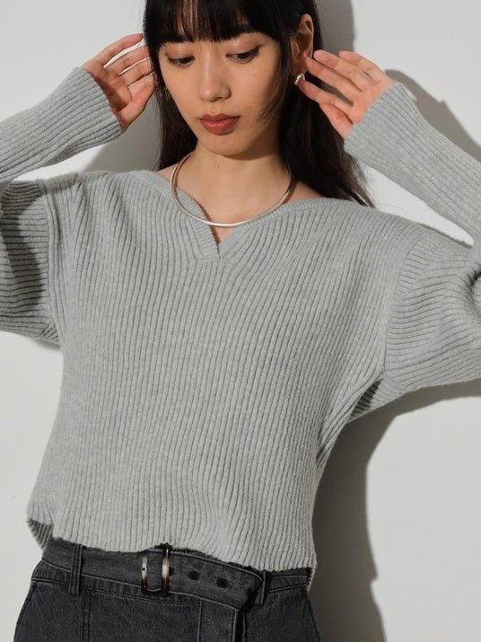 デコルテラインを綺麗に見せてくれるVネックニット。