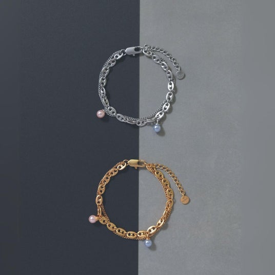 さりげなさと鮮やかさを兼ね備えた2色のパールが、上品な華やかさを添え、存在感のあるコマデザインとシンプルな2種類のチェーンが絶妙なバランスで高級感を演出します。秋冬には重ね付けで奥行きのあるスタイリングを、夏にはシンプルなスタイルのアクセントとして映える、季節やシーンを問わず一年を通して活躍できるアイテムです。