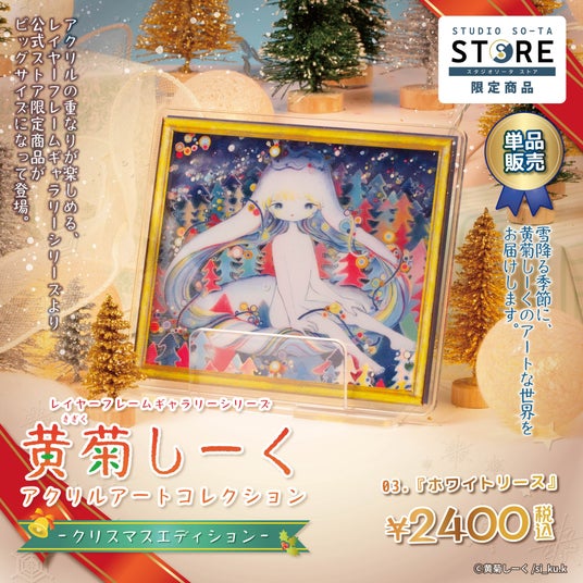 玩具メーカーのスタジオソータ(本社:東京都渋谷区、代表:安藤こうじ)は、黄菊しーく×スタジオソータ「黄菊しーくアクリルアートコレクション クリスマスエディション」 (単品 2,400円(税込) / コンプリートセット 7,500円(税込))を、販売いたします。2024年12月下旬発売予定となります。予約受付を開始 (スタジオソータストア (https://store.so-ta.com/ ) しております。