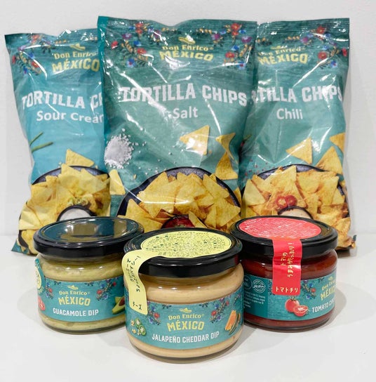 トルティーヤチップにおすすめのディップ。グァカモレ(アボカド)、トマトチリ、ハラペーニョチェダーチーズの3種類。