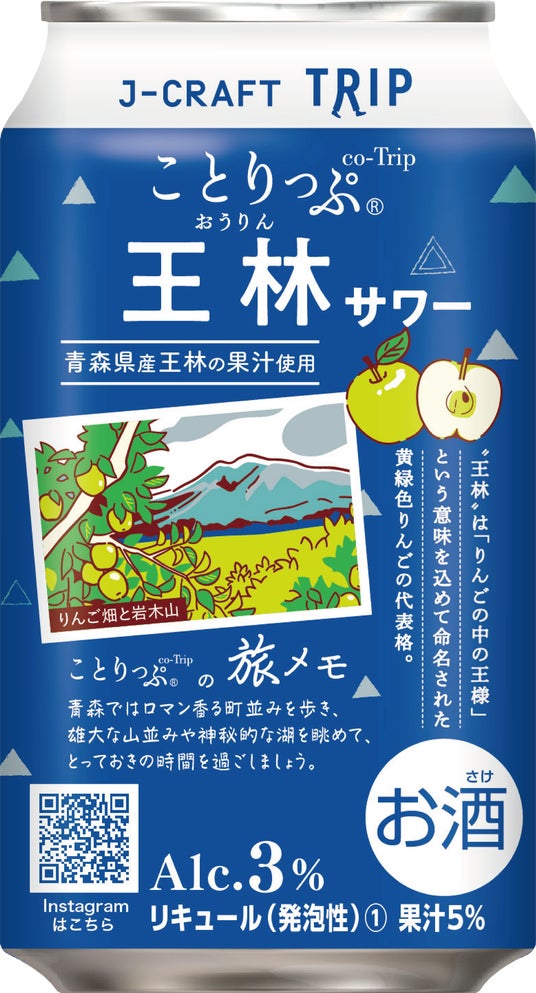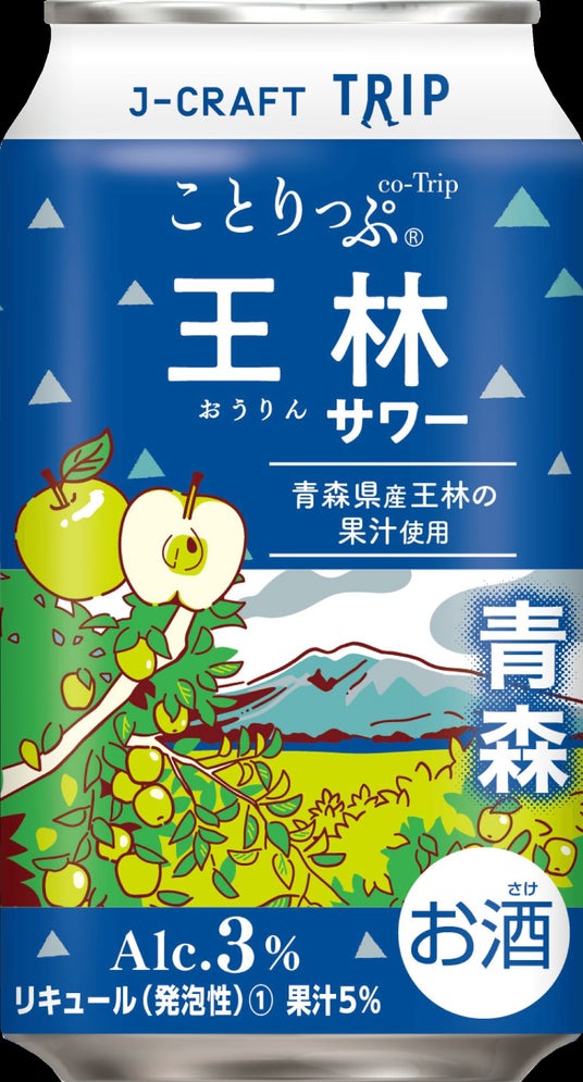 前回も「可愛い」とのお声をいただいたパッケージは、ことりっぷ「青森」ガイドブックの表紙柄をベースに、りんご畑と岩木山のイラストを配しています。程よく楽しめるアルコール度数 3 %、一日の終わりのほっとする時間に最適です。
