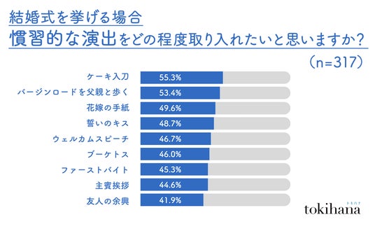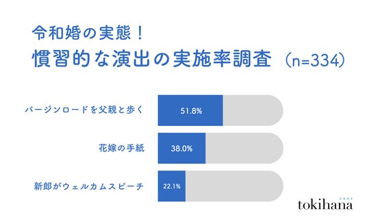 LINEでできる式場探し『トキハナ(https://tokihana.net/)』を運営する株式会社トキハナ(本社:東京都港区、代表取締役社長:安藤 正樹、以下 「トキハナ」)は、20代~30代の2023年4月以降に結婚式をした、もしくはする予定の334人と、20代~40代の317人を対象にインターネットリサーチを実施し、結婚式における最新の慣習の変化を明らかにしました。従来の結婚式の形式や演出が見直され、現代の多様な価値観に沿った内容に変わった事実が浮き彫りになっています。