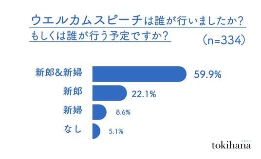 従来、新郎のみが行うのが一般的だったウエルカムスピーチが、現在では「新郎新婦で行う」スタイルが最も多く、59.9%のカップルに採用されています。これにより、式の開始から二人の個性を反映する傾向が強まっています。