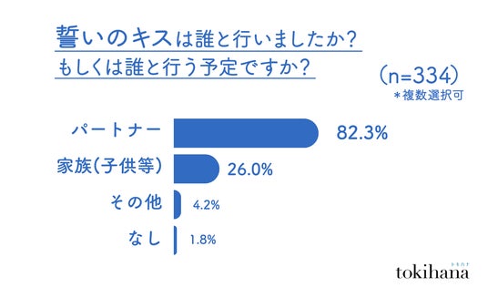 定番の「誓いのキス」は82.3%がパートナーと行っているものの、26.0%が子供と一緒に家族で行うなど、個々の価値観に沿った形で誓いを行っています。