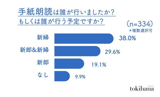 「手紙朗読」は、9割以上のカップルが取り入れる感動的な演出として、依然高い人気を誇っています。従来は新婦のみが感謝の手紙を朗読する「花嫁の手紙」が一般的でしたが、実際に新婦が読むのは38.0%にとどまり、新郎新婦(29.6%)や新郎のみ(19.1%)が読み上げるスタイルも増加しています。この変化により、「手紙朗読」は新婦に限らず、両者が感謝の気持ちを共有する場として新たな価値を持ち始めています。