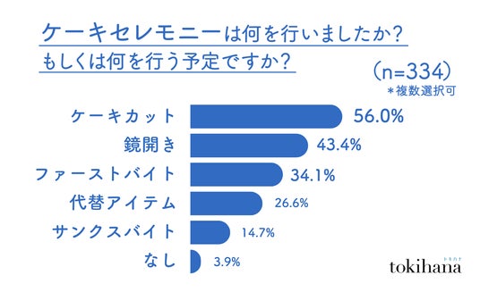 ファーストバイトが、65.9%のカップルにより実施されていないことが判明しました。代わりに、新郎新婦が親やお世話になった方に感謝の気持ちを込めてケーキを食べさせる「サンクスバイト」などのオリジナリティある演出も一定数みられており、伝統的なケーキセレモニーに限らず、感謝の気持ちを表現する場としての演出になっていることがわかりました。