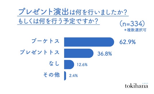 「幸せのおすそ分け」として定番のブーケトスは、依然として62.9%のカップルが実施していることが判明しました。一方で、ブーケトスに代わって「プレゼントトス」など、ゲスト全員が参加できる新しい演出も増えつつあります。