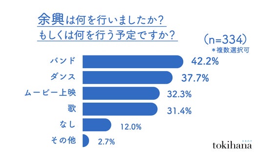 ダンスやバンドなどの余興は約4割のカップルによって実施されており、結婚式の盛り上げ方にバリエーションが見られます。一方で、約12.0%のカップルは余興を行わず、ゲストとの歓談時間をメインにするスタイルを選んでいることがわかりました。