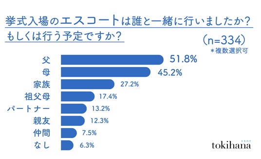 従来の伝統的なスタイルである「父親と歩く」挙式入場を行っているのは、51.8%。代わりに母親や、家族と入場する新たなスタイルの選択肢がみられ、家族との結びつきを重視する傾向が強まっています。