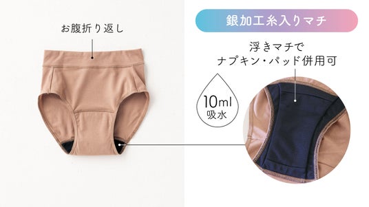 10mlの吸水機能があるマチ部分に銀加工糸を使用し抗菌防臭効果を持たせました。浮きマチ仕様なので、羽つきナプキンや吸水パッドとの併用も可能です。お腹部分はくい込みにくい折り返し仕様です。